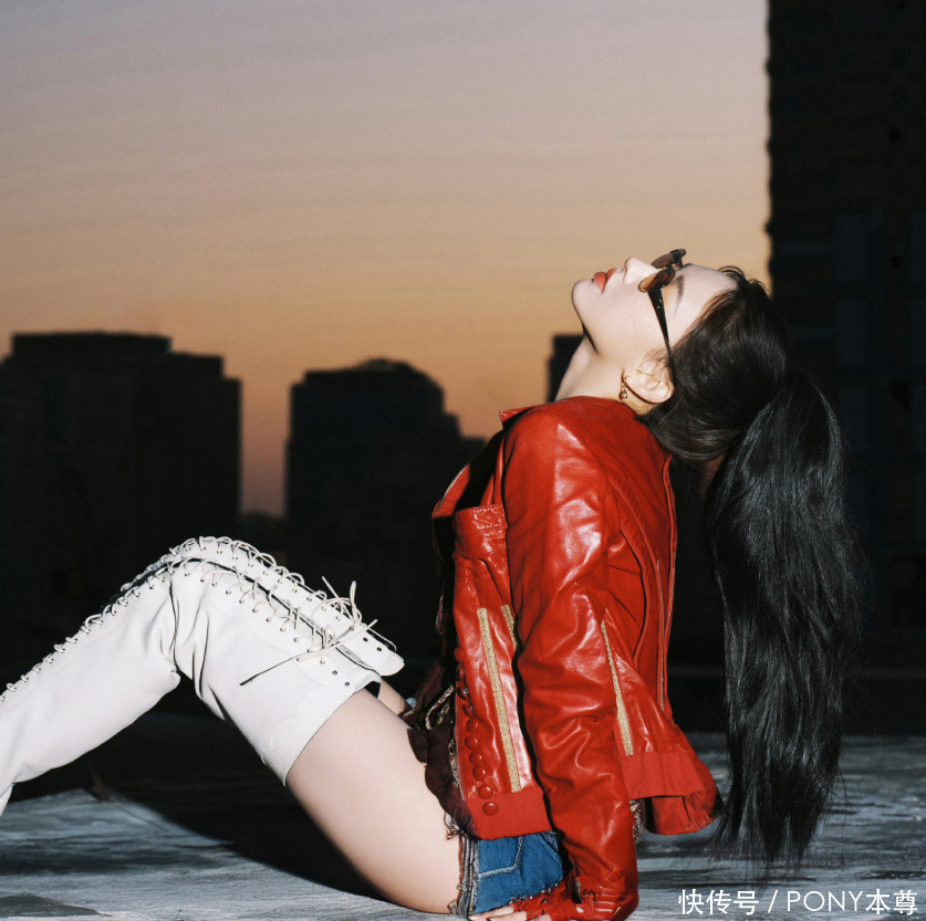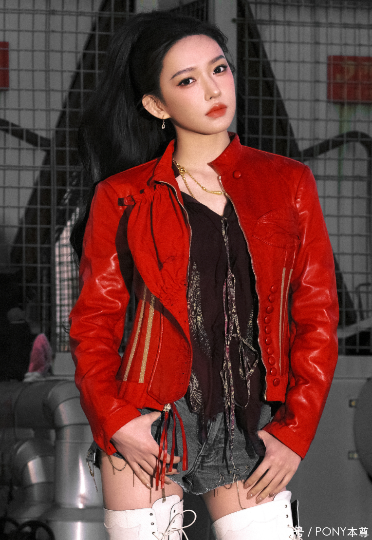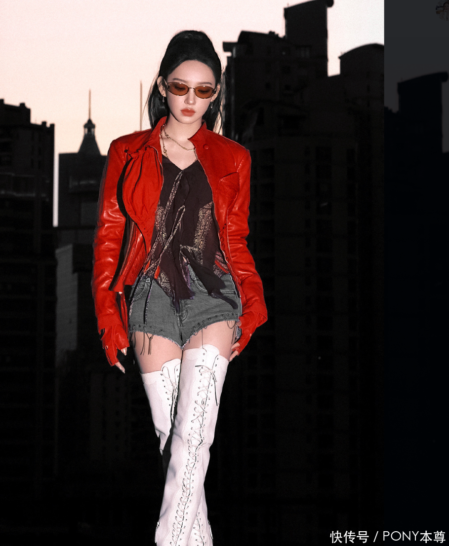 日常生活中很多人会喜欢穿短款皮衣,而程潇选择的这款红色立领短款皮衣,搭配黑色流苏背心,显白又显气质!搭配一条蓝色超短牛仔裤,腰部以下全是腿!!